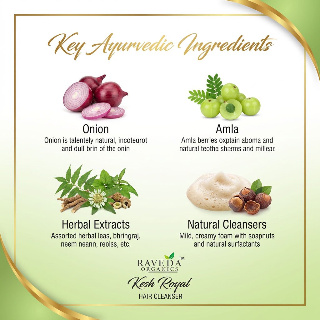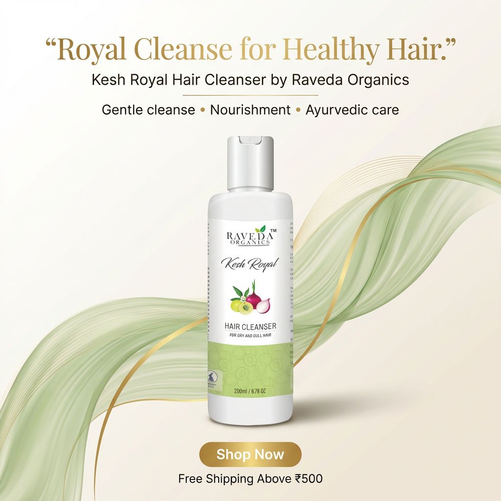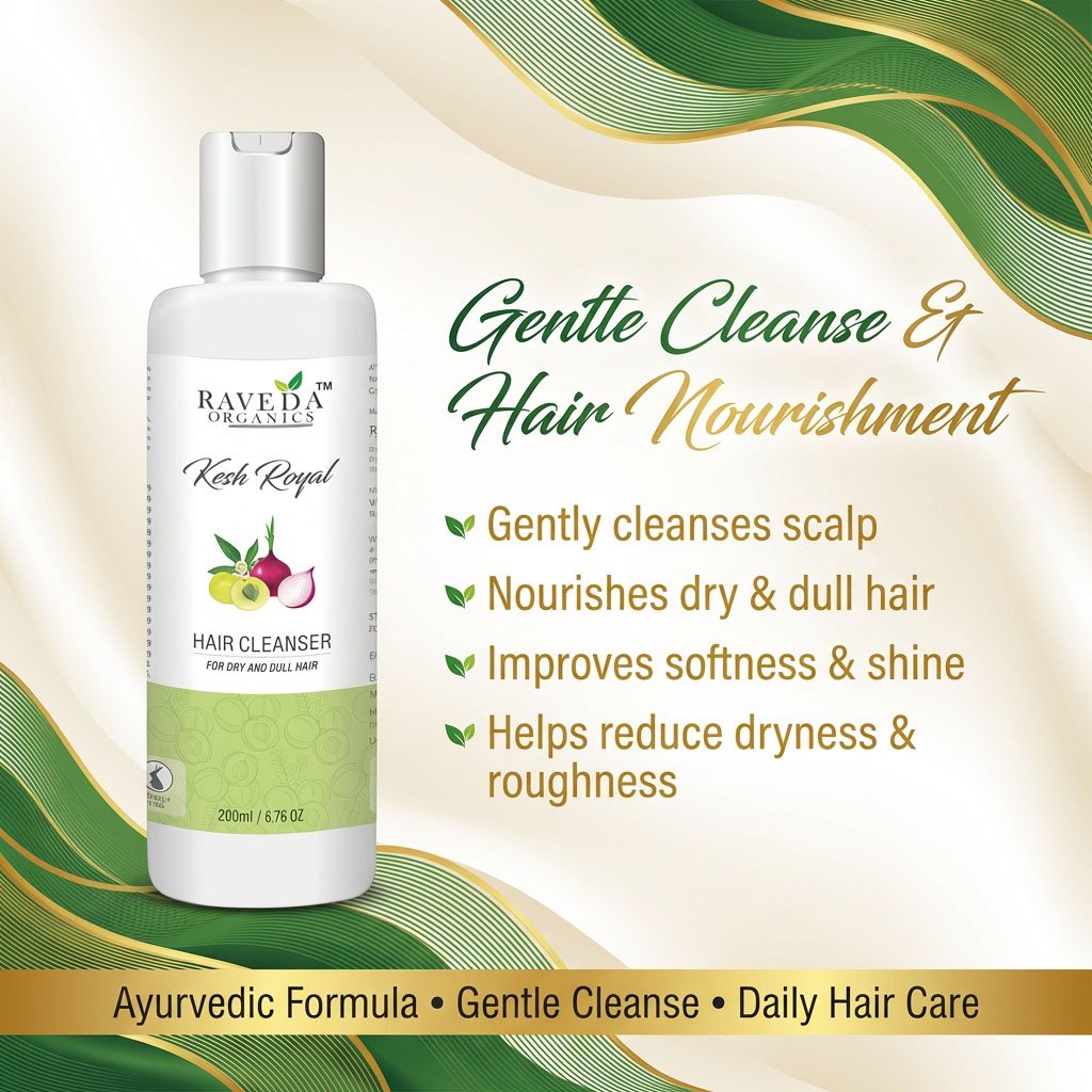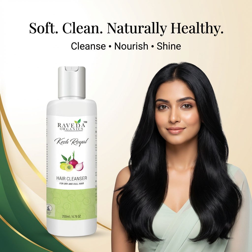 Raveda Organics Kesh Royal Hair Cleanser is a mild, herbal-based shampoo designed to cleanse hair without stripping natural oils. Enriched with traditional Ayurvedic ingredients, it helps nourish the scalp, reduce dryness, and improve hair texture.