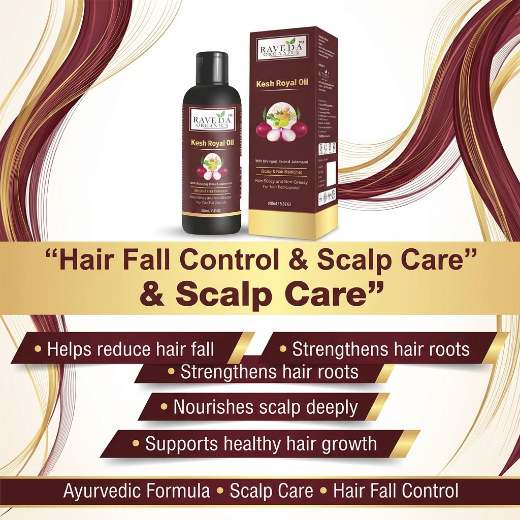Raveda Organics Kesh Royal Oil is a traditional Ayurvedic scalp & hair medicine enriched with Bhringraj, Onion & Jatamansi, known for supporting hair fall control and scalp nourishment.