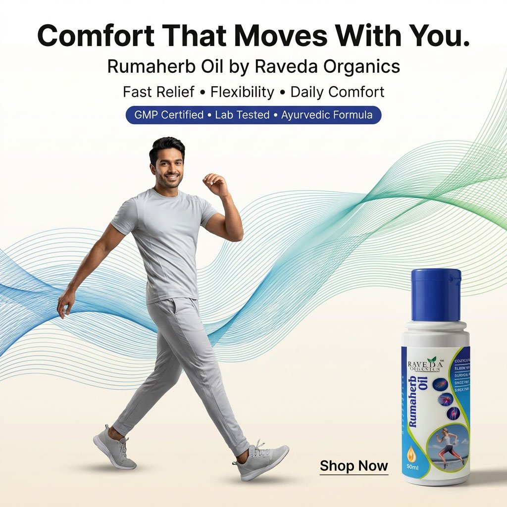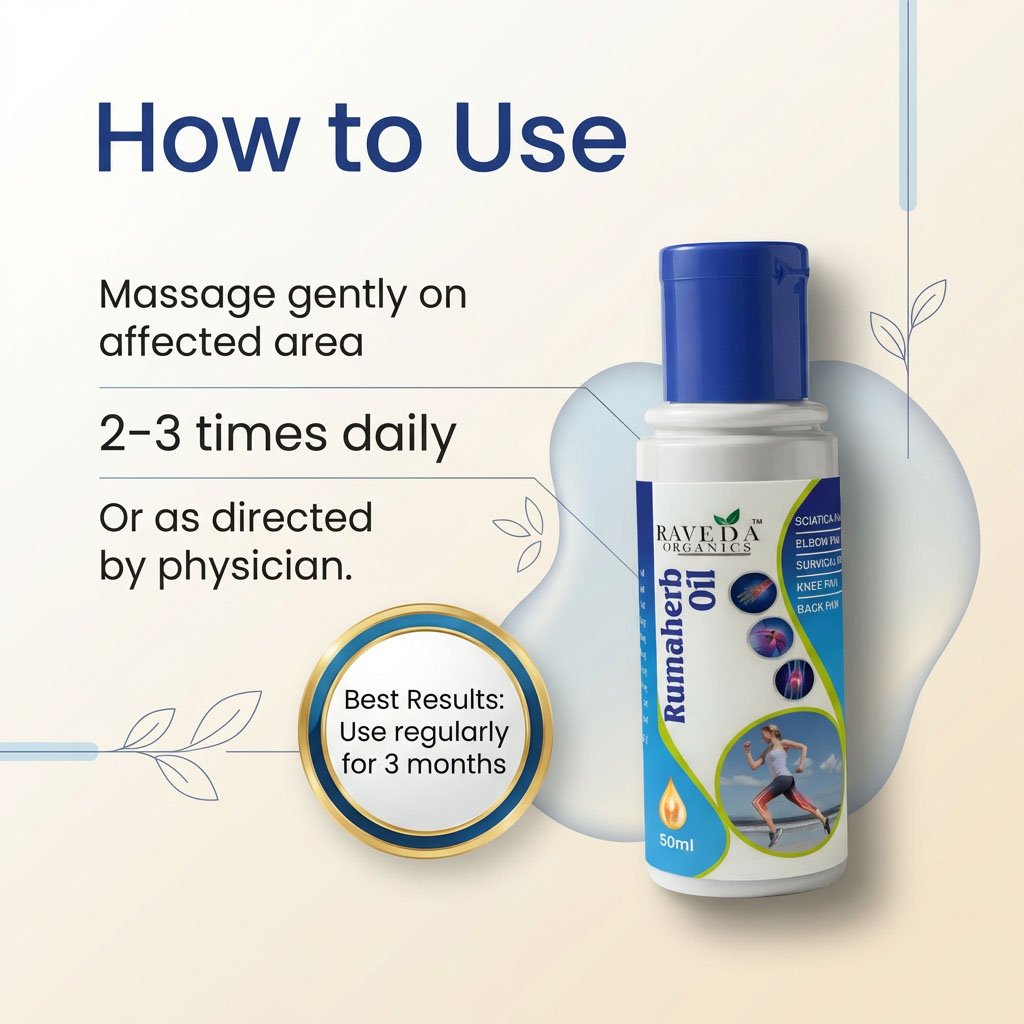Raveda Organics RumaHerb Oil Ayurvedic herbs & oils ke powerful combination se bana hai jo pain ke root cause par kaam karta hai, inflammation ko reduce karta hai aur mobility improve karta hai.