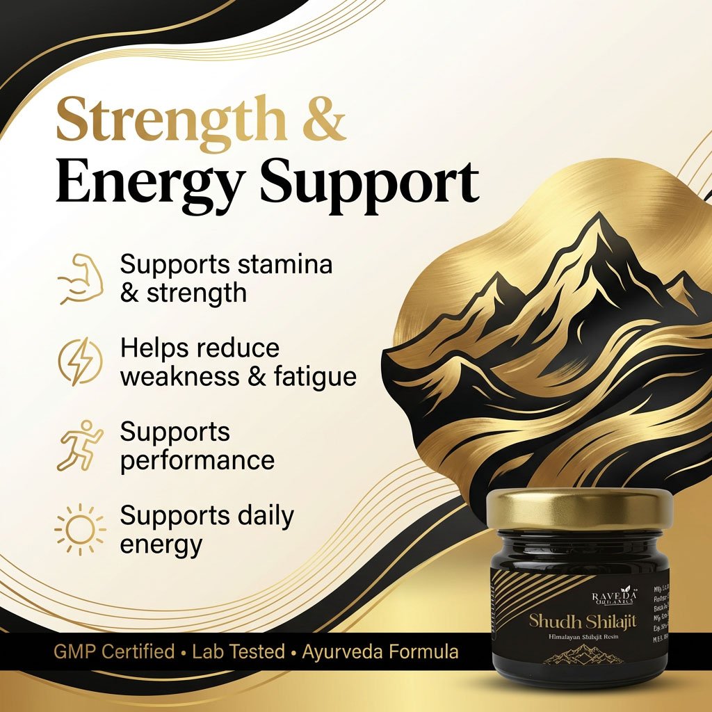 Modern lifestyle, stress aur poor nutrition ke kaaran body weak aur low-energy feel karti hai. Raveda Organics Shudh Shilajit andar se strength build, mental & physical performance improve aur overall vitality enhance karne me madad karta hai.