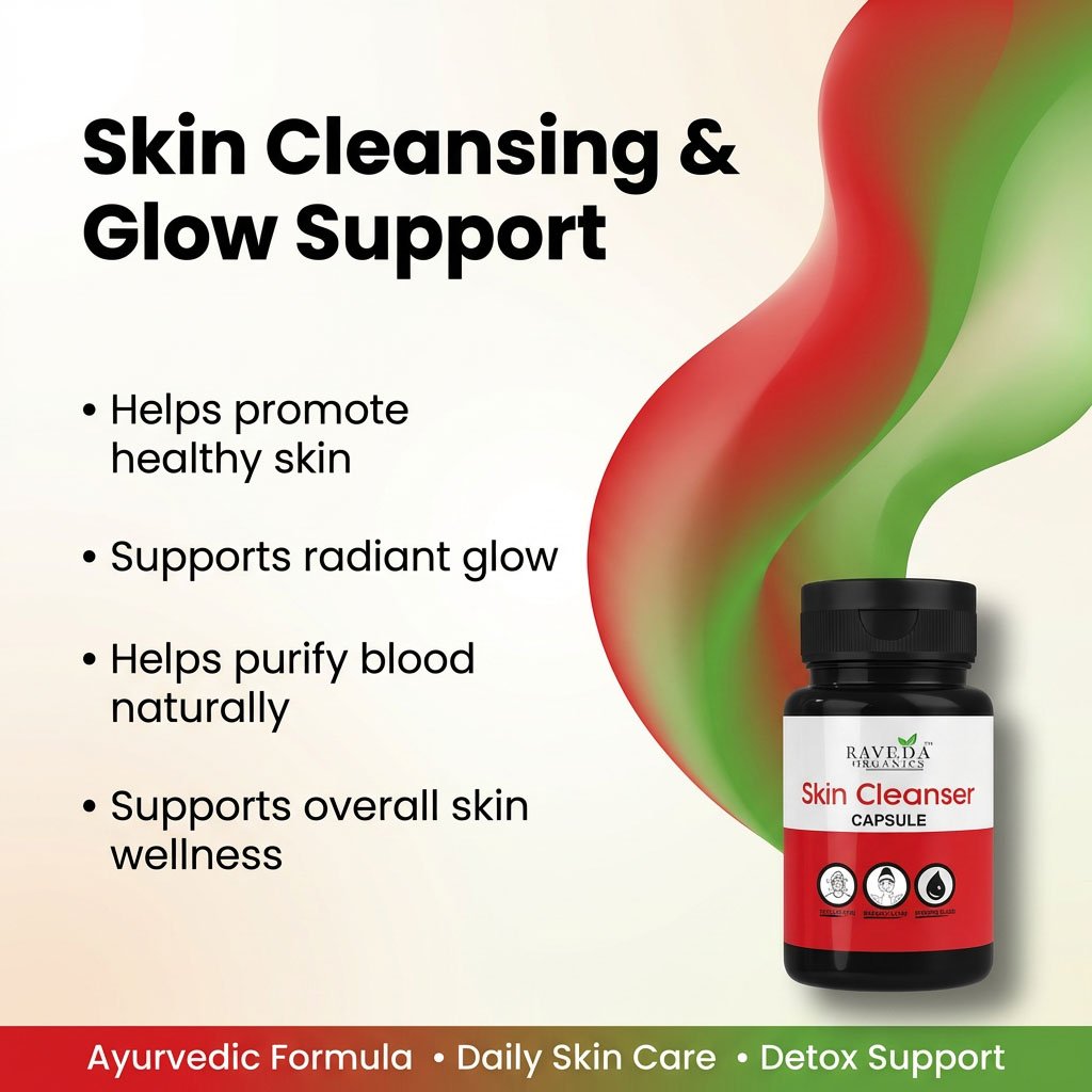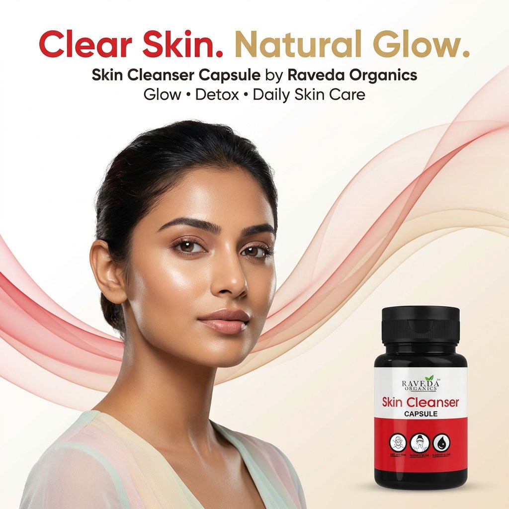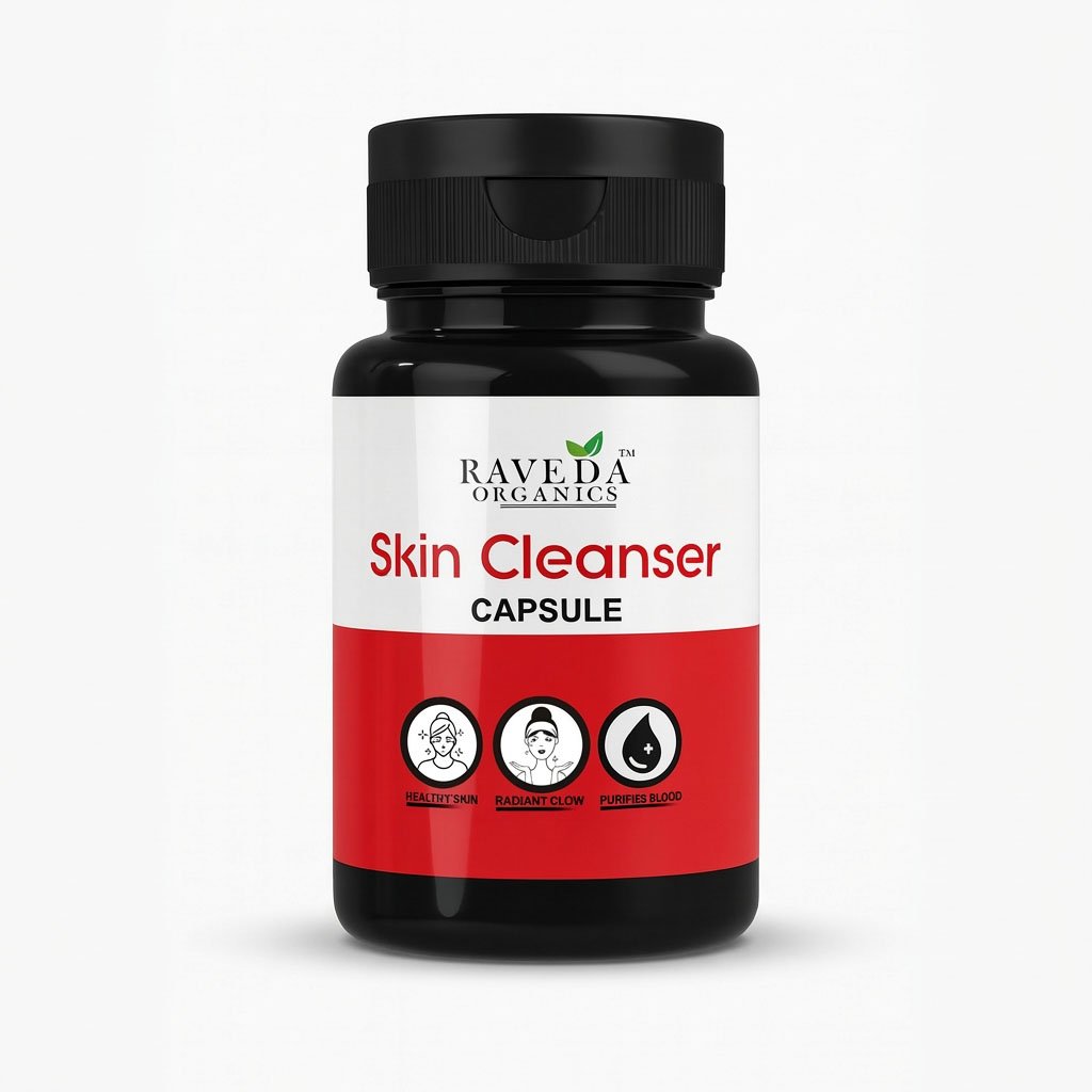 Raveda Organics Skin Cleanser Capsule blood purification + internal detox ke through skin ko naturally clear aur radiant banane me madad karti hai.