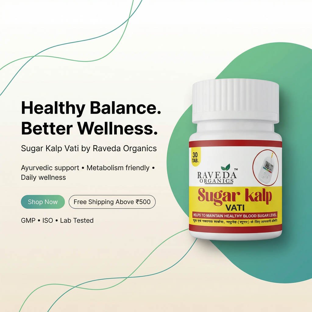 Crafted using time-tested Ayurvedic herbs and mineral supplements, Sugar Kalp Vati works gently from within to support long-term wellness. Raveda Organics ensures GMP-certified, lab-tested, quality-assured Ayurvedic products, trusted by customers across India.