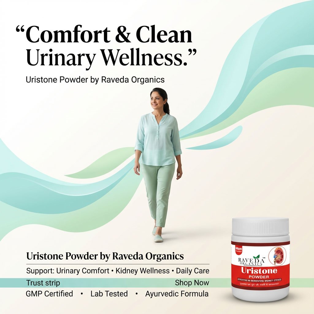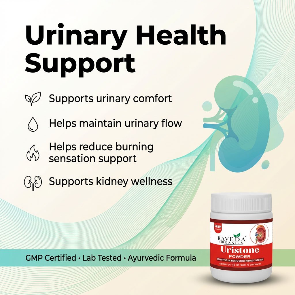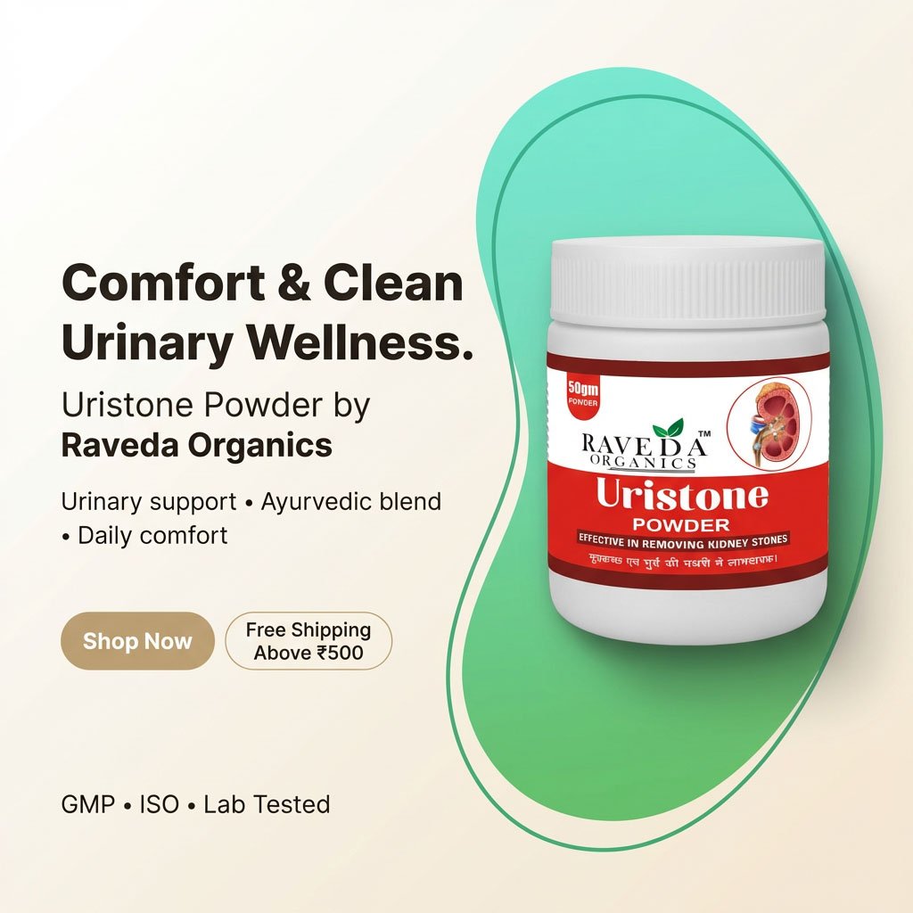 Raveda Organics Uristone Powder specially kidney stones aur urinary disorders ke liye develop kiya gaya hai. Improper hydration, high salt intake aur lifestyle imbalance ke kaaran kidney me stones develop ho jaate hain, jo severe pain aur urine problems create karte hain.